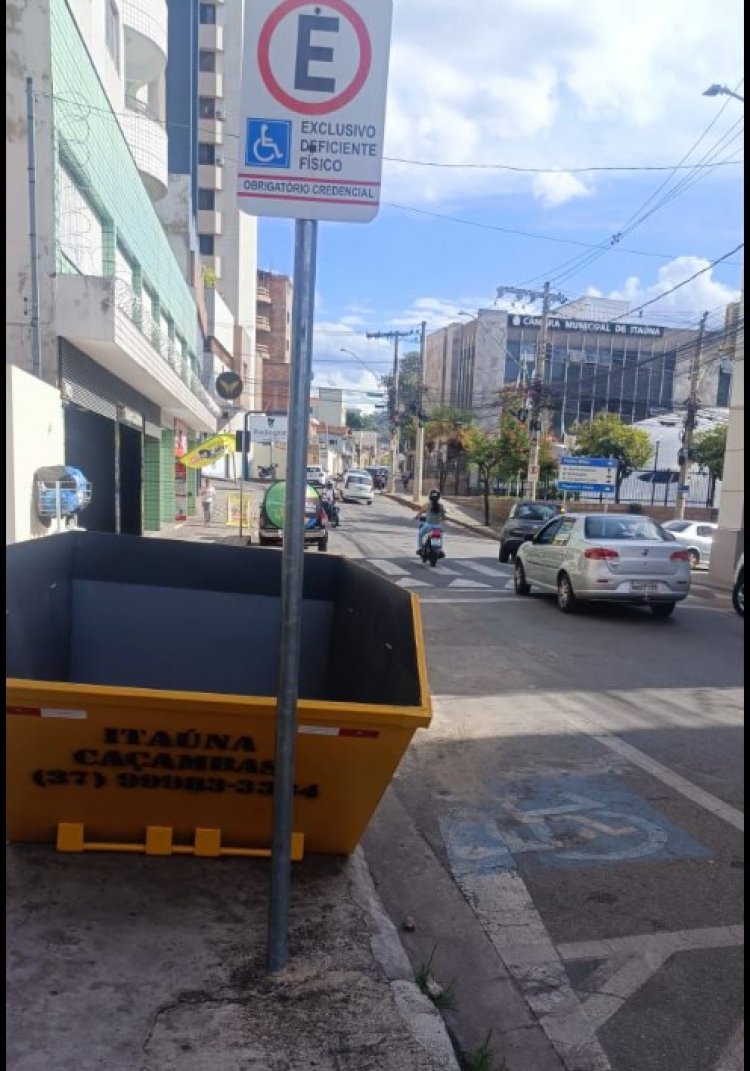Uma vaga de estacionamento para deficientes físicos existente na Rua Getúlio Vargas, próximo da farmácia básica, foi praticamente anulada pela colocação de uma caçamba de entulhos ao lado dela. O fato foi denunciado por um cidadão em imagem postada no Instagram. Conforme estabelece a legislação, essas vagas têm área maior que as demais, para que a pessoa possa se locomover ao desembarcar do veículo. Também é necessário que seja deixada área para a locomoção da pessoa após o desembarque. Ao colocar uma caçamba ao lado da vaga, o que se faz é limitar a locomoção de uma pessoa que necessita desta área, dadas as suas limitações impostas pela deficiência. A caçamba colocada obriga, ainda, os passantes a irem para o meio da pista, pois impede totalmente a passagem das pessoas. Pedem os reclamantes que a referida caçamba seja retirada do local e que o espaço seja deixado livre para a locomoção das pessoas com deficiência e, também, para as demais pessoas que passam pelo local. Com a palavra o setor de fiscalização da Prefeitura, seja de Posturas, seja do Trânsito, e até mesmo da Secretaria de Desenvolvimento Social, que abriga o setor de proteção às pessoas com deficiência, bem como os vereadores, que se reúnem semanalmente bem próximo daquele local.