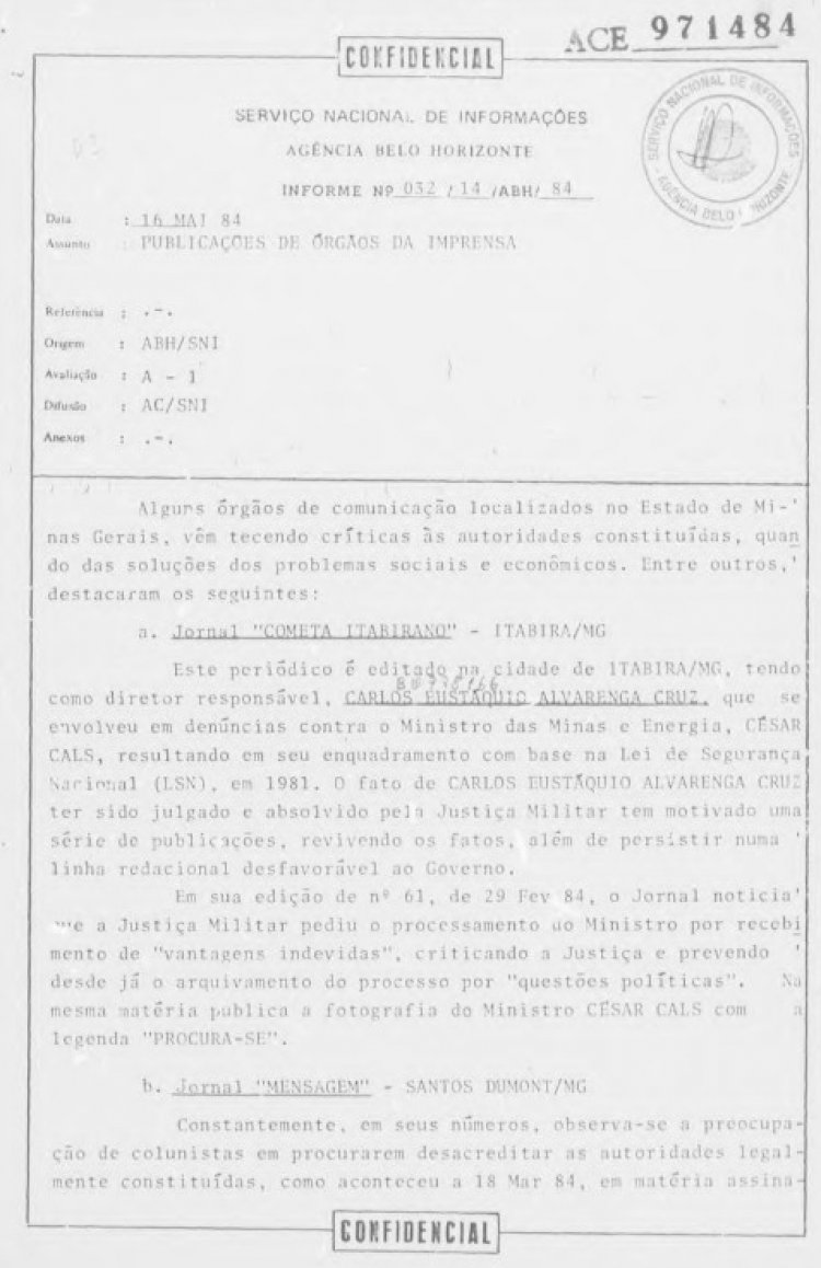 Em meio ao processo de redemocratização brasileira, marcado por mobilizações populares como a campanha das Diretas Já, amplamente difundida em 1984, e pela progressiva reconfiguração que culminaria na promulgação da Constituição de 1988, documentos classificados como confidenciais revelam que a vigilância sobre a imprensa não apenas persistia, como operava de forma estruturada, sistemática e tecnicamente organizada, alcançando inclusive a imprensa local de cidades do interior.