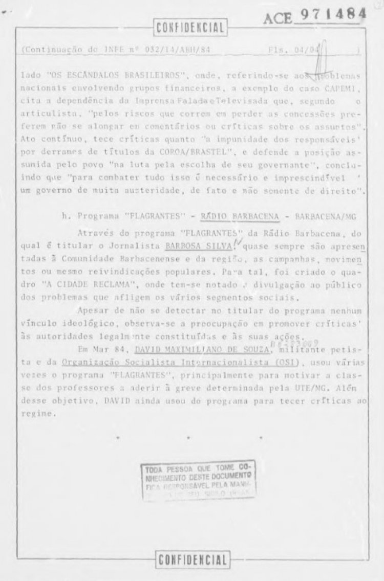 Por fim, o caráter confidencial do informe reforça seu valor histórico. Não se trata de um discurso público, elaborado para legitimar o regime perante a sociedade, mas de um documento interno, destinado à circulação restrita dentro do aparato estatal. Isso o torna particularmente revelador: nele se expressa, com menos filtros, a mentalidade de um sistema que, mesmo em processo de abertura, ainda operava sob a lógica da vigilância, do controle e da contenção.