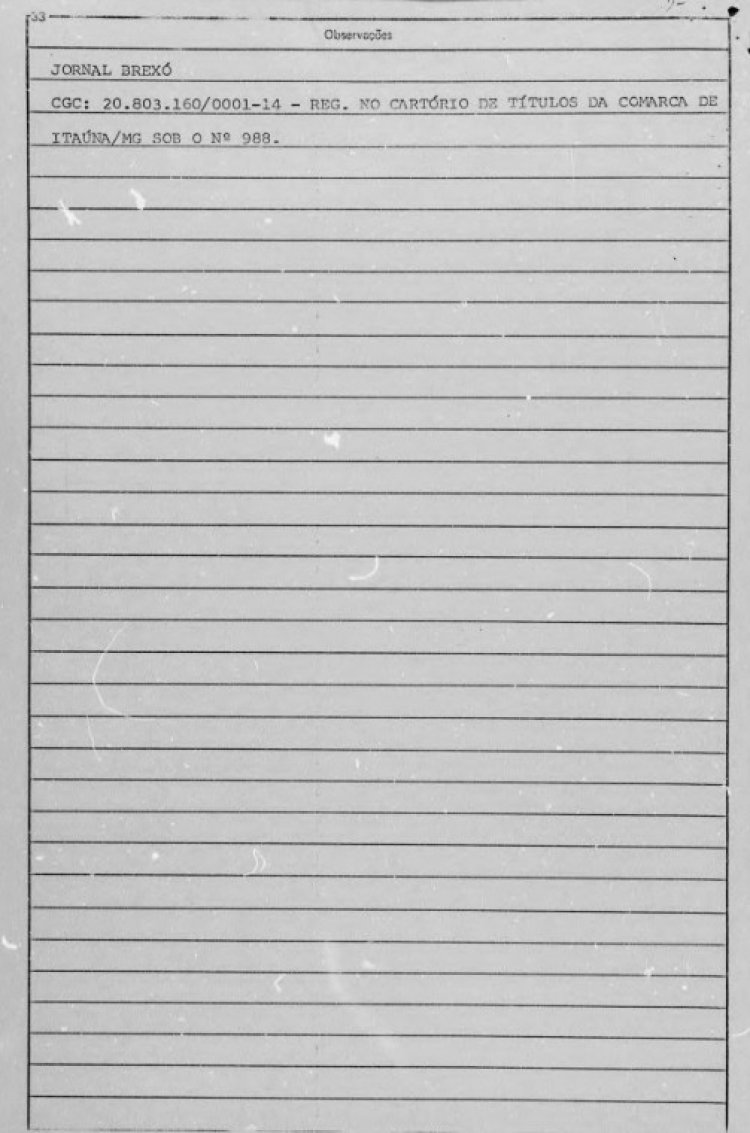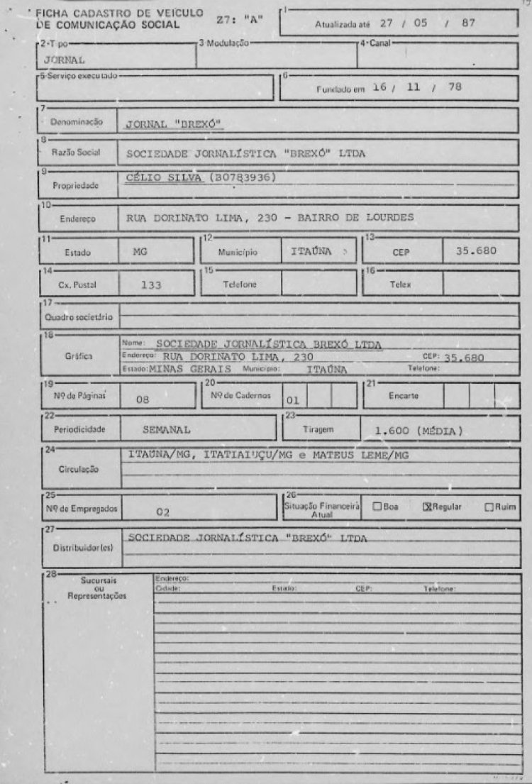 O Jornal Brexó passa a ser descrito minuciosamente: razão social Sociedade Jornalística Brexó Ltda, sede na Rua Dorinato Lima, nº 230, bairro de Lourdes, em Itaúna/MG, fundado em novembro de 1978, com periodicidade semanal, tiragem média entre 1.600 e 1.700 exemplares e circulação regional abrangendo Itaúna, Itatiaiuçu e Mateus Leme. Sua estrutura é classificada como reduzida, com apenas dois funcionários e situação financeira considerada “regular”. Também são registrados aspectos técnicos como número de páginas (entre 6 e 8), formato em caderno único, ausência de encartes e inexistência de sucursais.