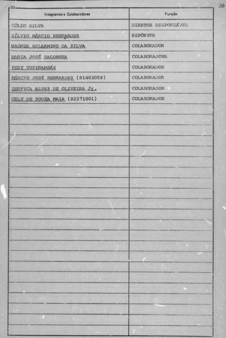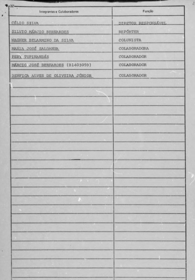 Esse nível de detalhamento não é meramente descritivo. Ele indica uma tentativa de mensurar o alcance e a capacidade de influência do jornal, inserindo-o em uma lógica de avaliação estratégica. Paralelamente, as fichas revelam um mapeamento completo de seus integrantes e colaboradores, identificados nominalmente: Célio Silva (B0783936), diretor responsável; Sílvio Márcio Bernardes, repórter; Wagner Belarmino da Silva, colunista; Maria José Saldanha, colaboradora; Pery Tupinambás, colaborador; Márcio José Bernardes (B1403059), colaborador; Benfica Alves de Oliveira Júnior, colaborador; e Hely de Souza Maia (B2271801), colaborador.