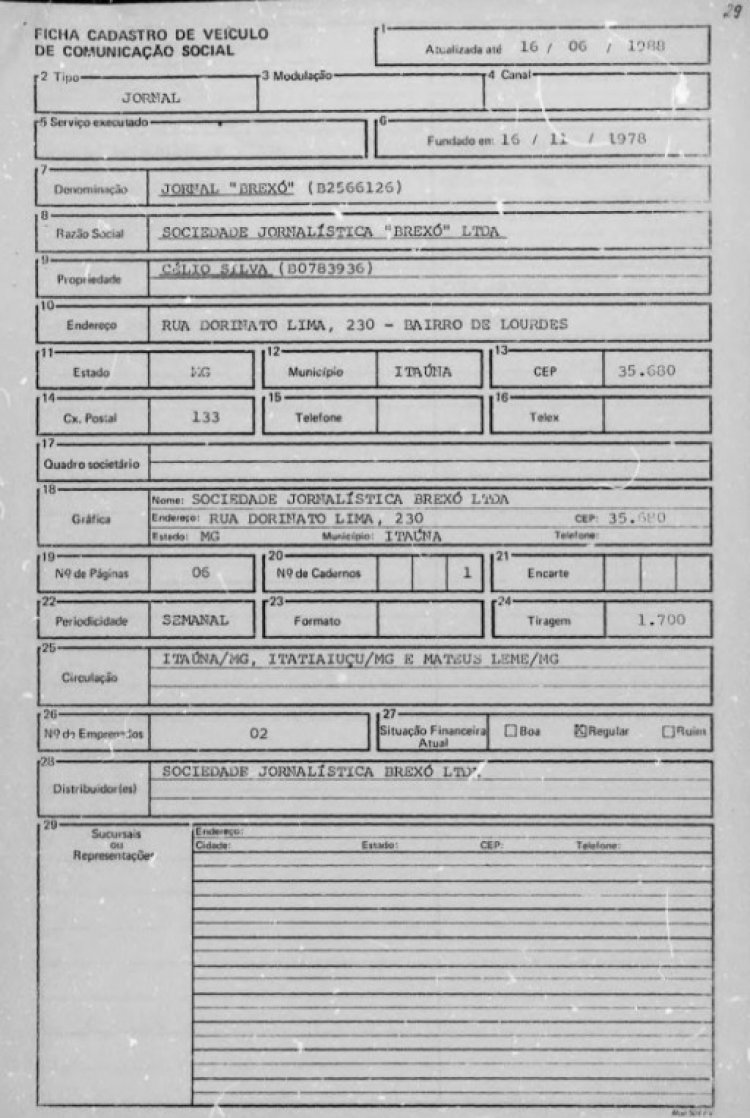 Na ficha de 1988, o próprio periódico também passa a ser identificado por um código interno, aparecendo como Jornal Brexó (B2566126), o que reforça a hipótese de um sistema estruturado de indexação tanto de pessoas quanto de instituições. Esse dado é particularmente relevante, pois demonstra que o jornal já não era apenas observado, mas integrado a um banco de dados organizado, com capacidade de rastreamento e acompanhamento contínuo.