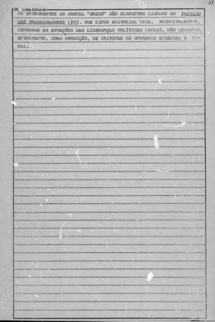 O elemento mais expressivo, contudo, encontra-se no campo denominado “Linha Editorial”, presente na ficha de 1988, no qual a linguagem assume caráter interpretativo. Nele, afirma-se que: “OS INTEGRANTES DO JORNAL ‘BREXO’ SÃO ELEMENTOS LIGADOS AO PARTIDO DOS TRABALHADORES (PT). SUA LINHA EDITORIAL VISA, PRINCIPALMENTE, CENSURAR AS ATUAÇÕES DAS LIDERANÇAS POLÍTICAS LOCAIS, NÃO DEIXANDO, ENTRETANTO, COMO OPOSIÇÃO, DE CRITICAR OS GOVERNOS ESTADUAL E FEDERAL”.