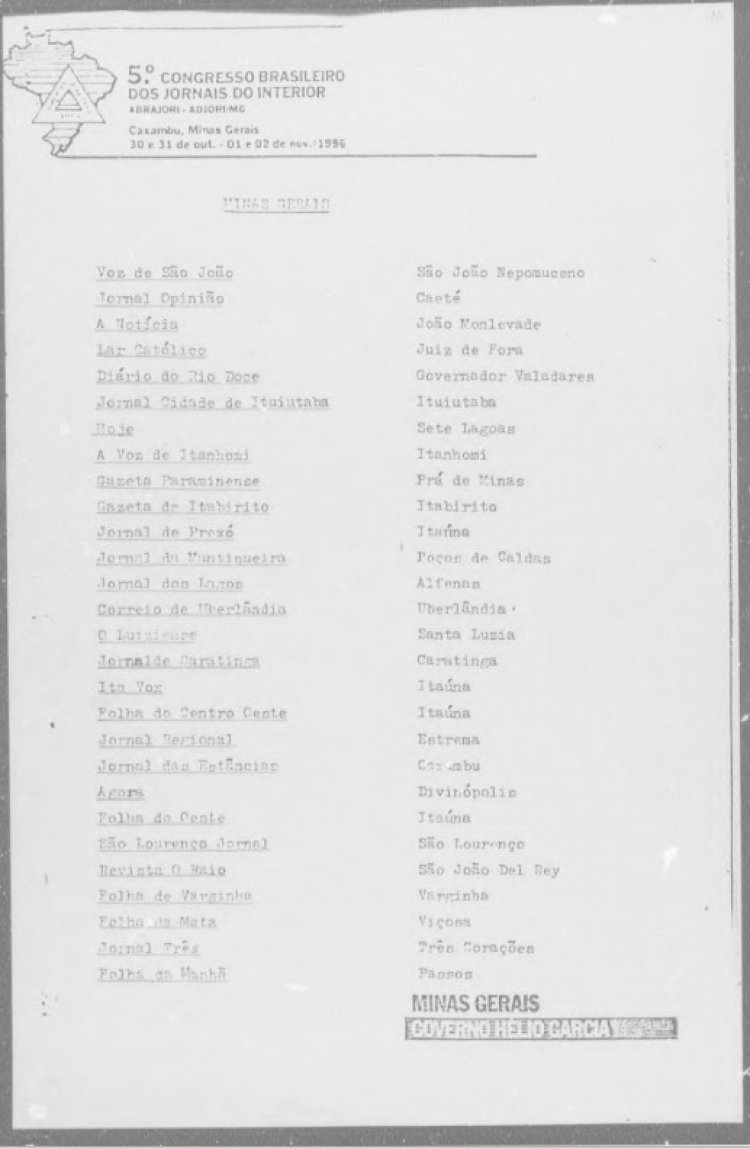 A documentação analisada revela ainda um elemento que amplia significativamente a compreensão do alcance desse monitoramento: a participação da imprensa regional em espaços coletivos de articulação, como o 5º Congresso de Jornais do Interior, realizado entre 30 de outubro e 2 de novembro de 1986, em Caxambu (MG), com a participação de cerca de 500 pessoas e representantes de diferentes estados brasileiros e países sul-americanos.
