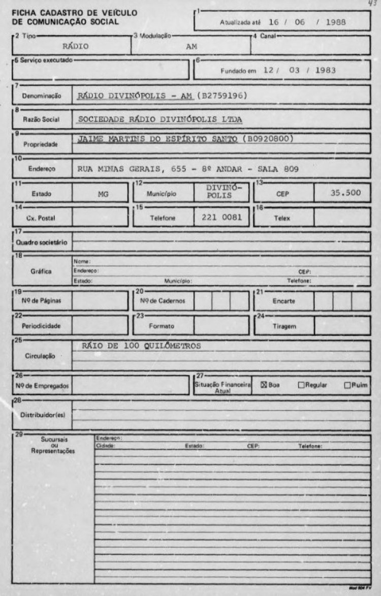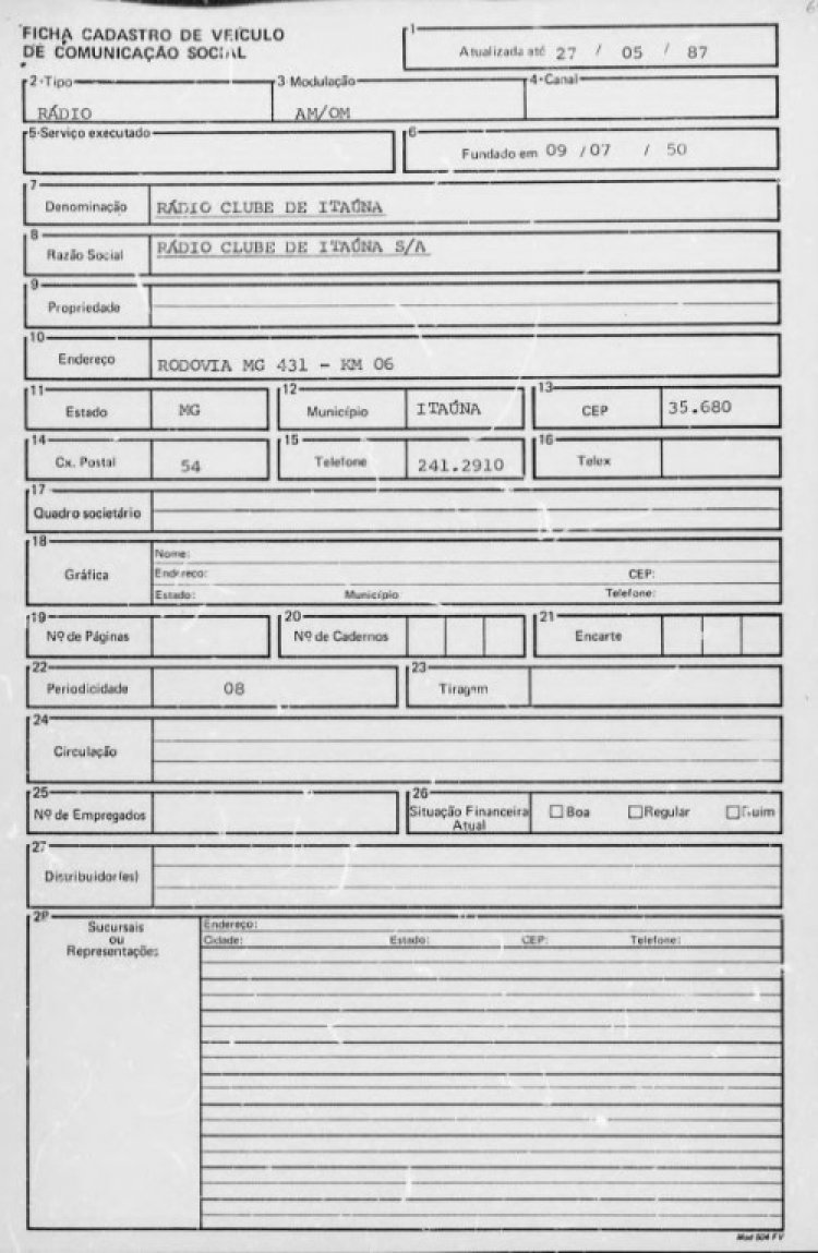 No caso da Rádio Clube de Itaúna, os documentos revelam que o veículo também foi incluído nas chamadas “Fichas de Cadastro de Veículo de Comunicação Social”, seguindo o mesmo padrão aplicado aos jornais da cidade. Assim como nos demais registros, há a coleta detalhada de informações institucionais, como endereço, estrutura administrativa e a identificação nominal de seus integrantes, acompanhados de suas funções.