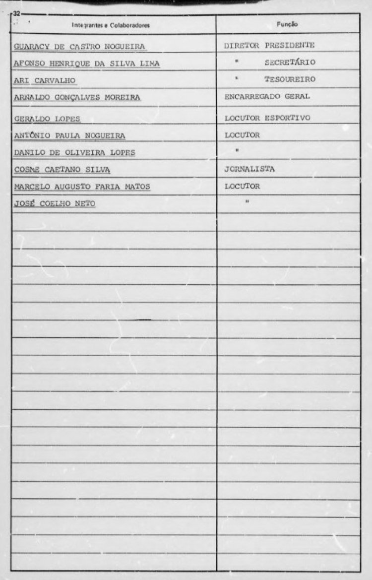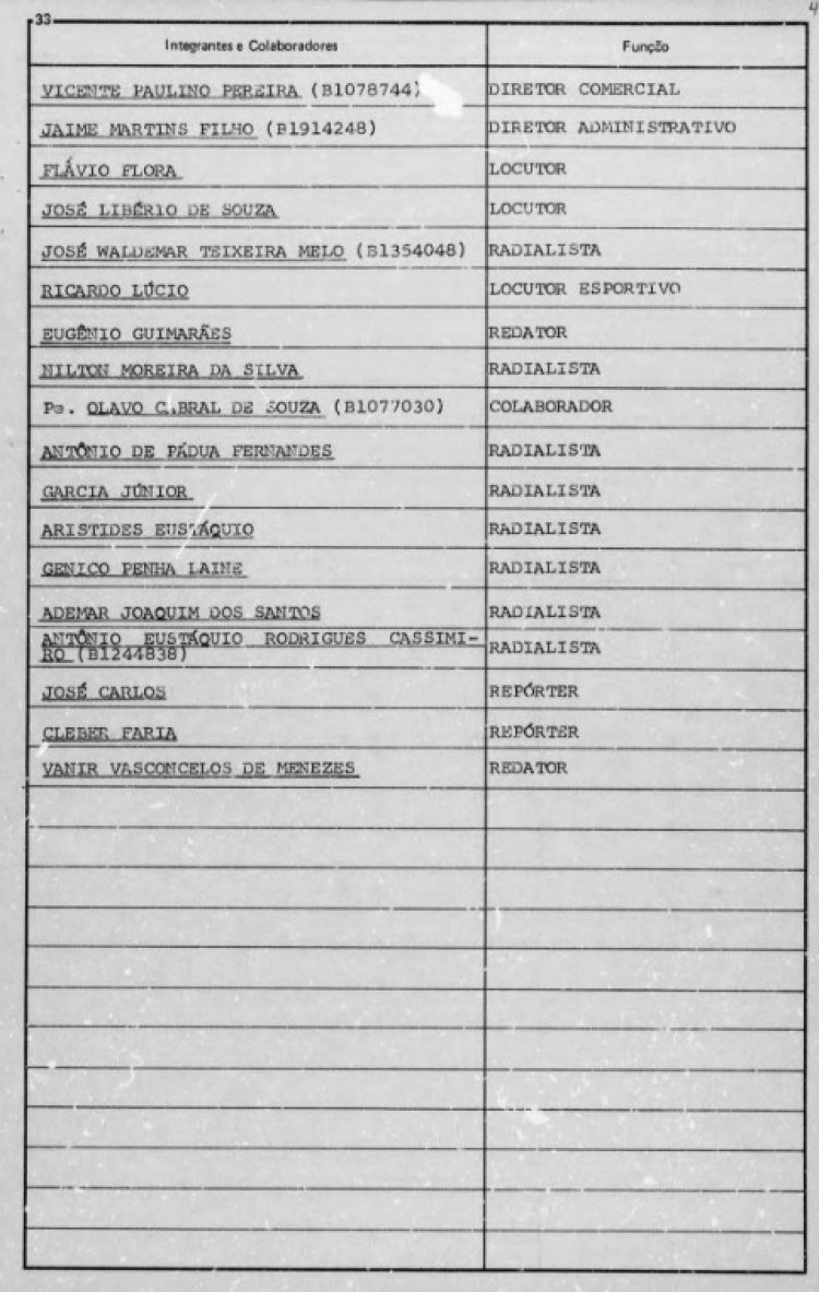 Entre os nomes registrados estão Guaracy de Castro Nogueira, diretor-presidente; Afonso Henrique da Silva Lima, diretor-secretário; Ari Carvalho, diretor-tesoureiro; Arnaldo Gonçalves Moreira, encarregado geral; Geraldo Lopes, locutor esportivo; Antônio Paulo Nogueira, Danilo Lopes de Oliveira e José Coelho Neto, locutores; além de Cosme Caetano Silva, jornalista, e Marcelo Augusto de Faria Matos, locutor. Esse conjunto de dados demonstra que o monitoramento não se limitava à imprensa escrita, alcançando também a radiodifusão local.