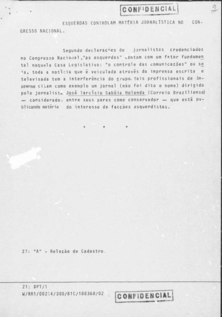 Esse evento também foi registrado pelo SNI como “Confidencial” e identificado pelos códigos “B1C”, “RR1”, Z7 “A” e “W”, o que amplia significativamente a compreensão do alcance desse sistema de vigilância.