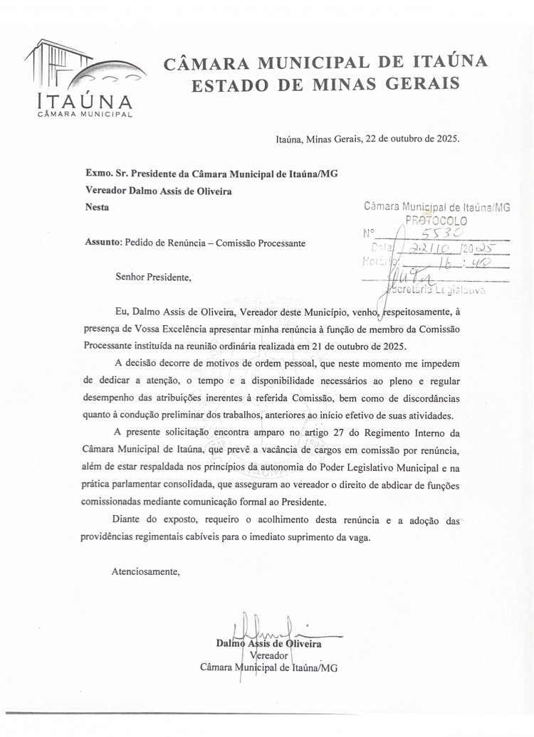 Após vários atos na tentativa de conseguir uma cópia do documento protocolado por Dalmo de Assis, pedindo a renúncia, o presidente da Câmara não conseguiu mais segurar, e liberou uma cópia para a imprensa.